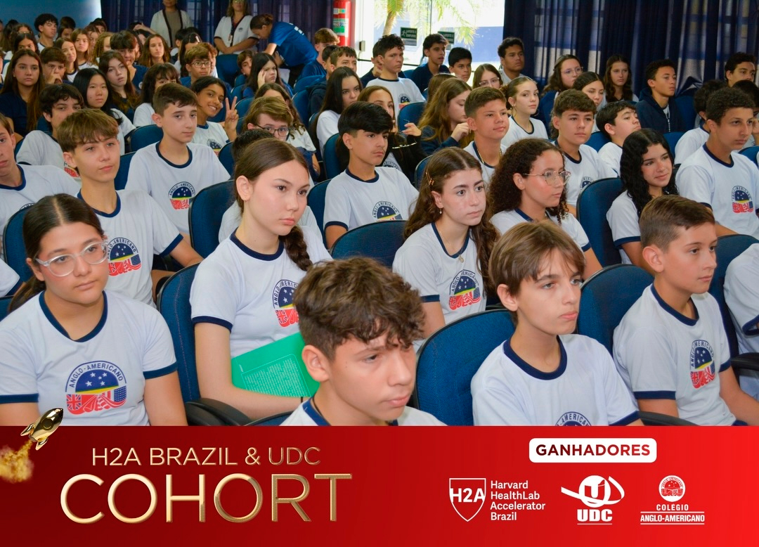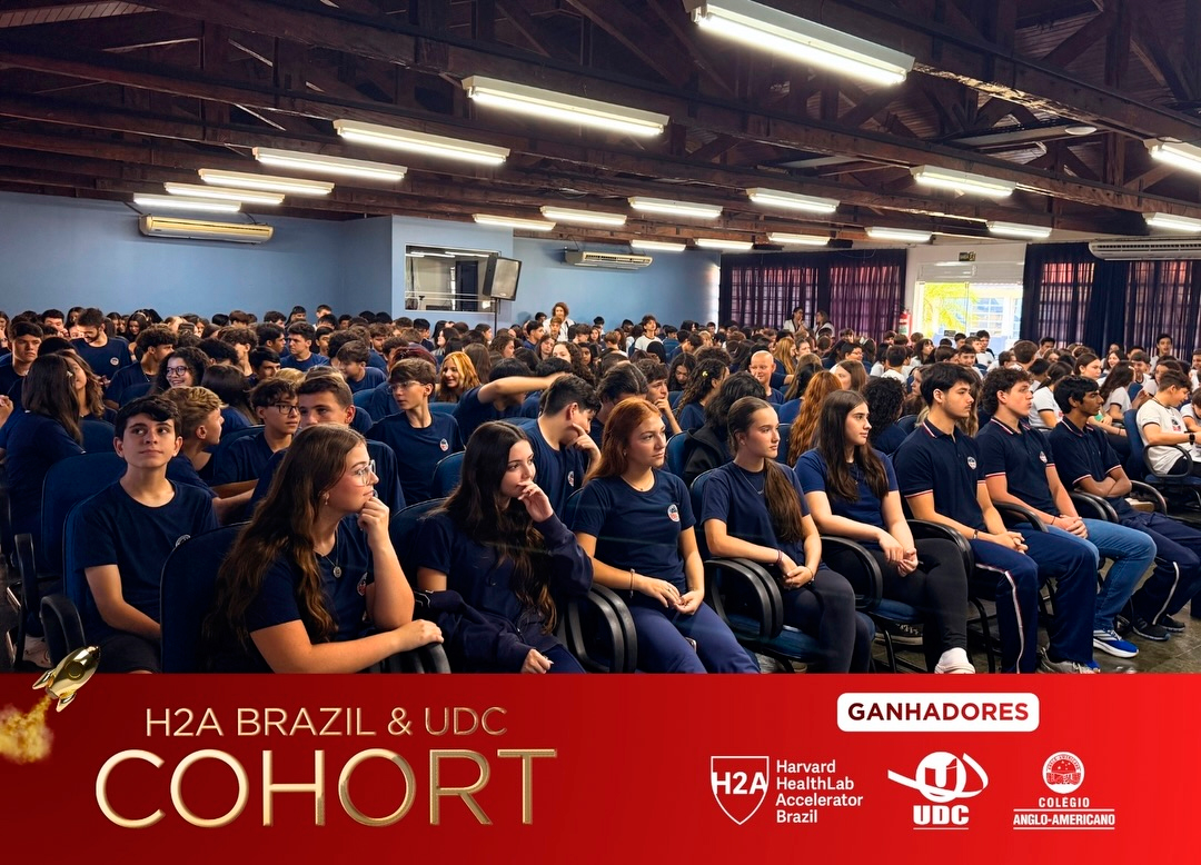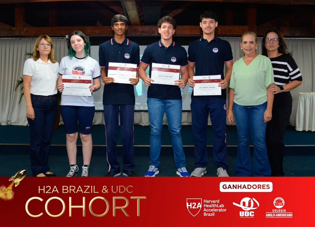 Representando o Colégio Anglo-Americano em escala global, recebem a certificação UDC & H2A (Harvard HealthLab Accelerator Brazil) os alunos: Aksharan Sethurathinam Arunachalam, Davi Pereira Januário, Maria Luiza Matteazzi Vital e Rafael Felipe Fabri.
